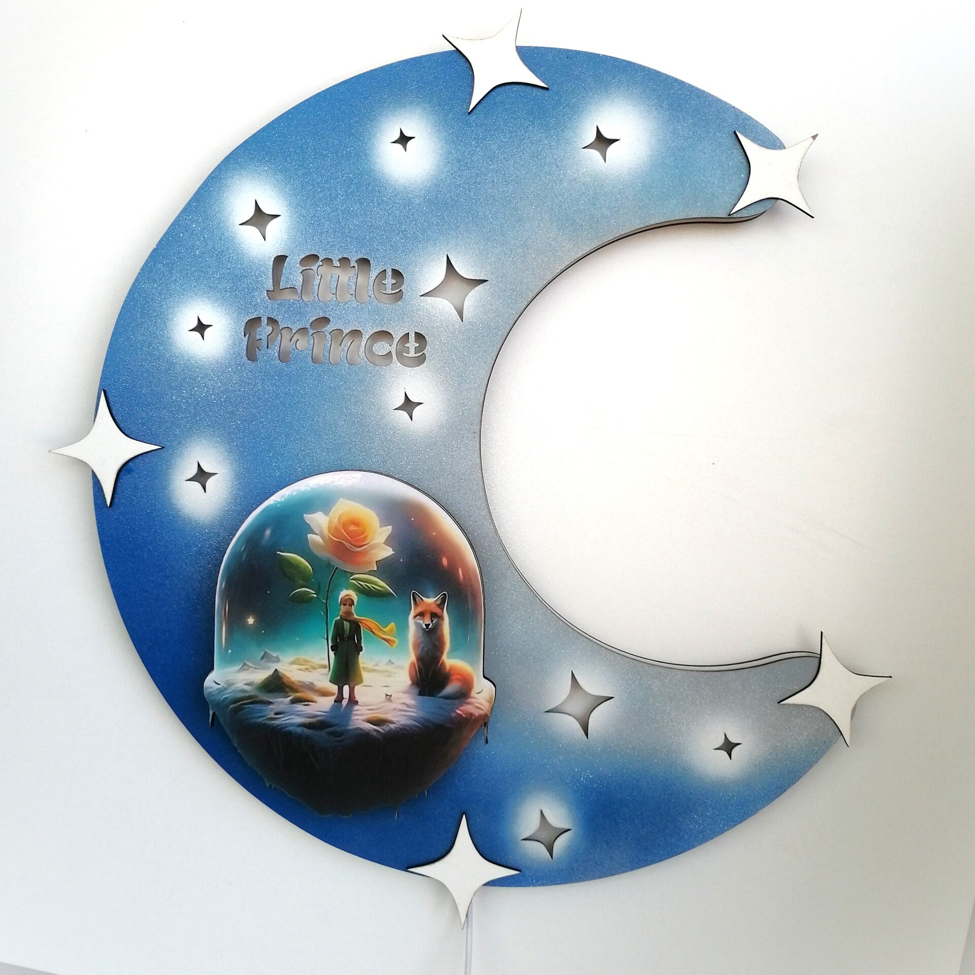 Χειροποίητο ξύλινο φωτιστικό ''Μικρός πρίγκιπας'', κατασκευασμένο εξ'ολοκλήρου στο εργαστήριο μας. Υλικό κατασκευής : MDF πάχους 3χιλ. Λειτουργεί με ένα απλό usb για λόγους ασφαλείας. Συμπεριλαμβάνεται λεντοταινία λευκού φωτισμού, διακόπτης on/off. Μήκος καλωδίου 1μ.